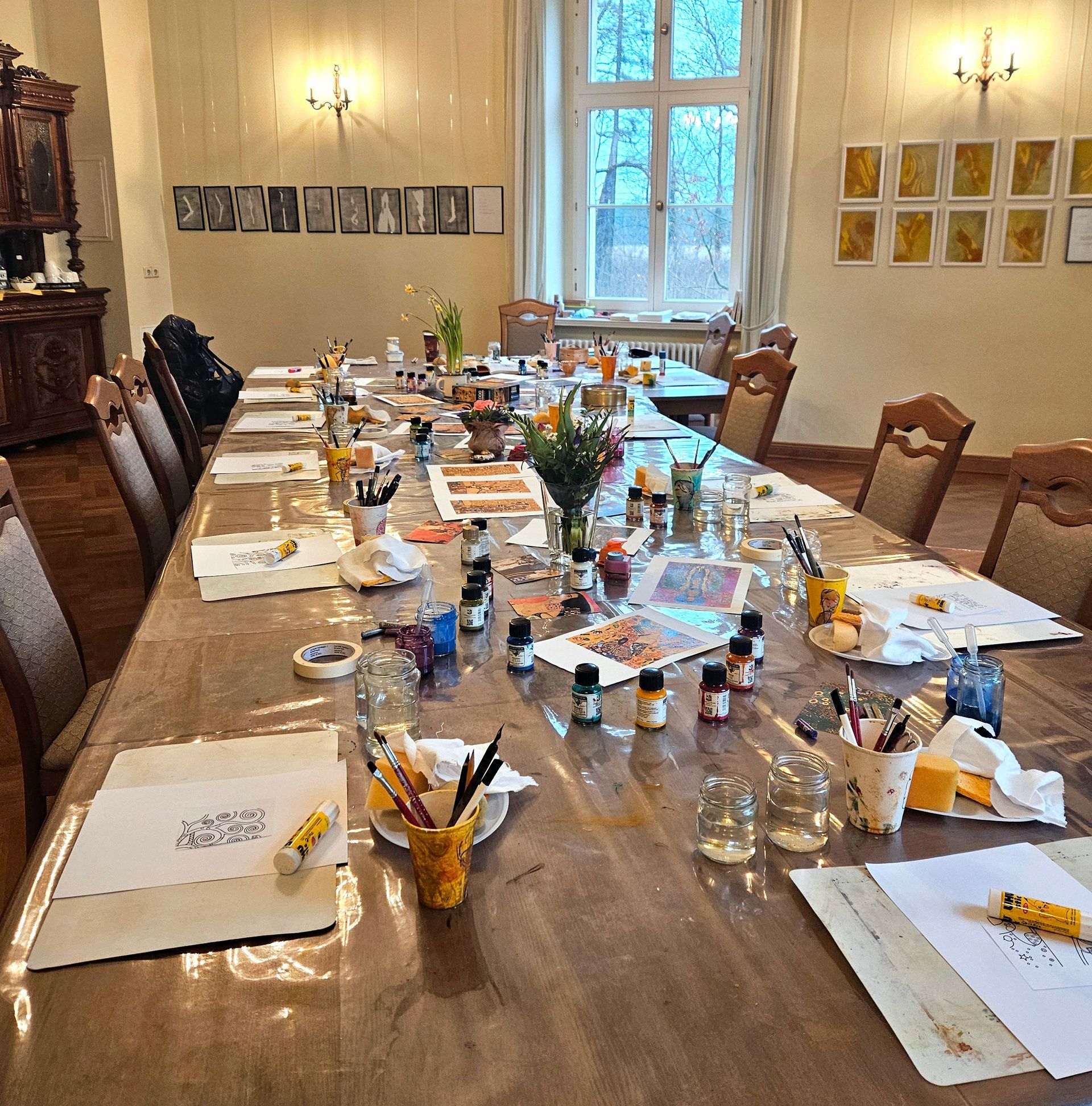Für diese kreative Auszeit nutzen wir den sogenannten "Grünen Salon" im Schloss. Dieser ist gleichzeitig auch unser Ausstellungsraum mit wechselnden Kunstausstellungen - also ein Ort, der inspiriert.